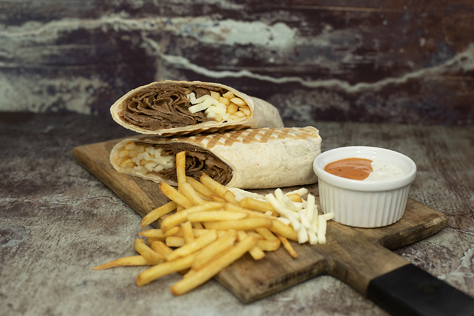 mięso do wyboru (wołowe, kurczak, mix), frytki, ser żółty, sos do wyboru (łagodny, średni, ostry, czosnkowy)