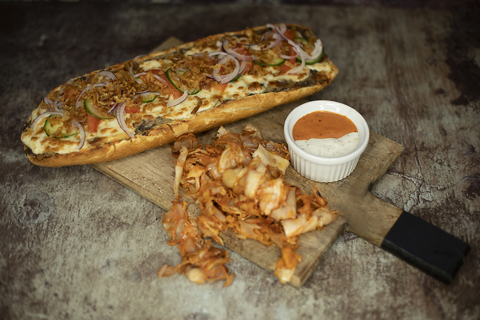 ser, pieczarki, mięso do wyboru (wołowe, kurczak, mix), dodatki do wyboru (ogórek, pomidor, cebula czerwona, cebula prażona), sos do wyboru (łagodny, średni, ostry, czosnkowy, ketchup)